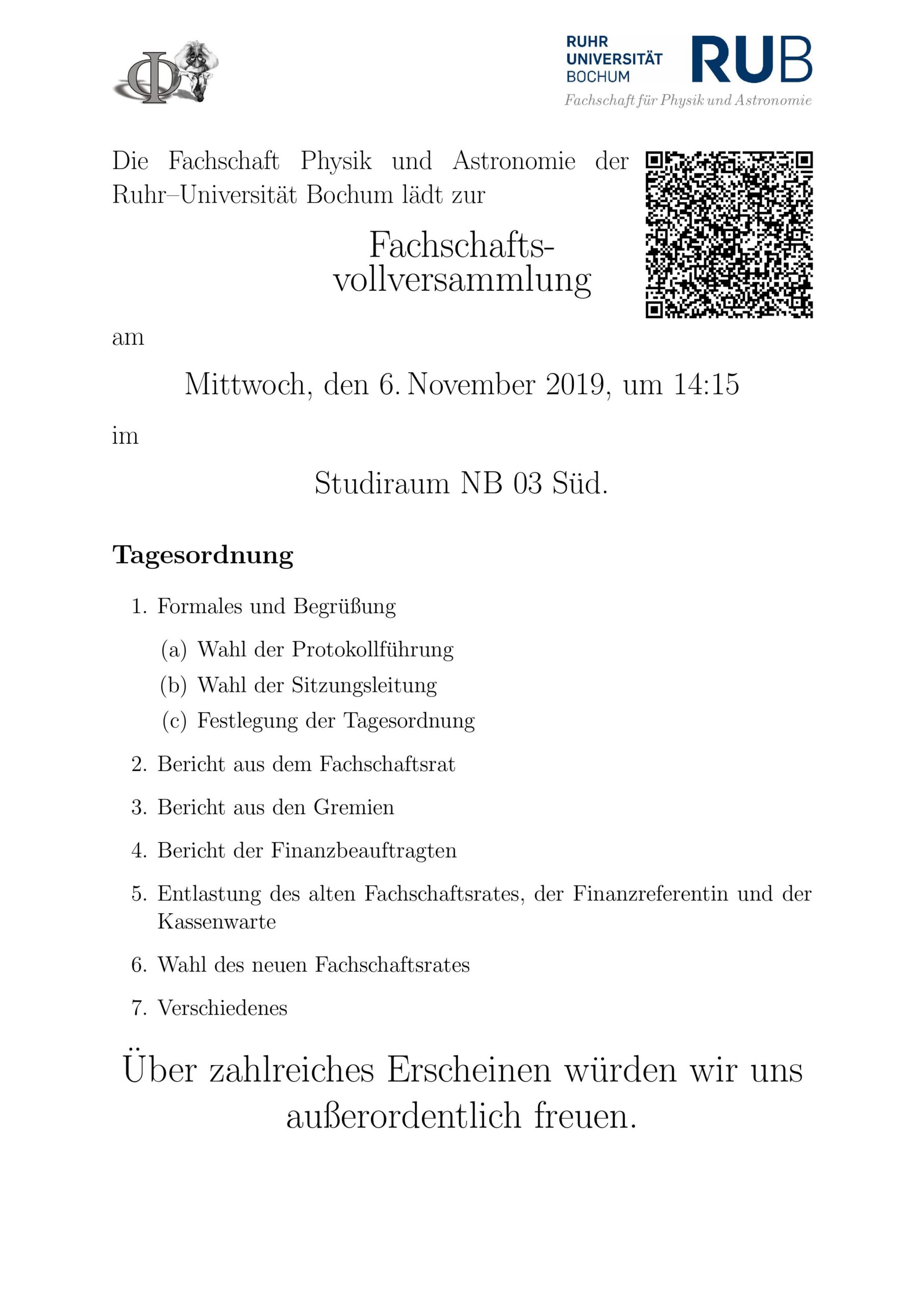 Wir wählen einen neuen Rat – für den man sich im Übrigen noch bewerben kann -, stellen eine Liste für die Fakultätsratswahl auf – für die man sich dann auf der VV persönlich bewerben darf.