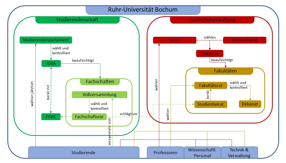 Das folgende Organigramm ist als grobe Übersicht über die Verbindungen der Gremien gedacht. Die Studierendenschaft und die Hochschulverwaltung sind parallele Organisationen, welche gemeinsam die Ruhr-Universität Bochum darstellen. Dabei unterteilen sich beide Organisationen in Fachschaften bzw. Fakultäten, welche weitgehende Selbstverwaltungsrechte besitzen. Als Studierender und damit Mitglied der RUB bist du wahlberechtigt für das Studierendenparlament und deinen Fachschaftsrat, sowie für die studentischen Mitglieder des Senats und deines Fakultätsrates!