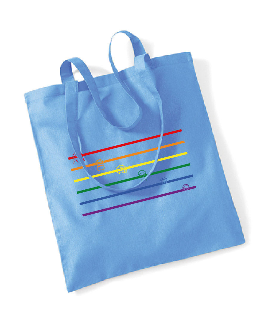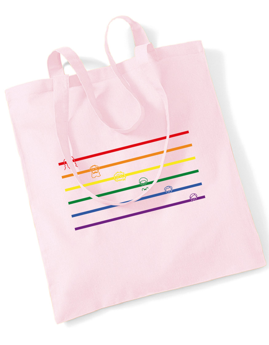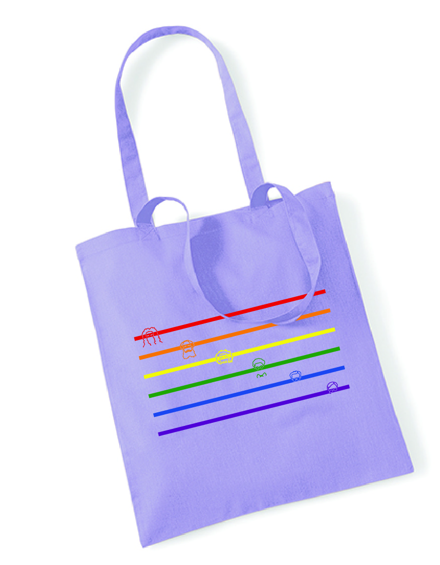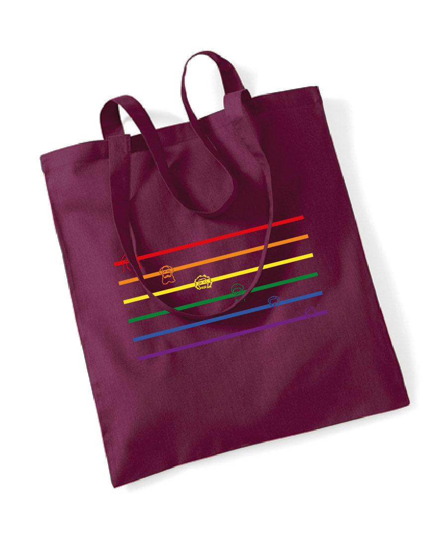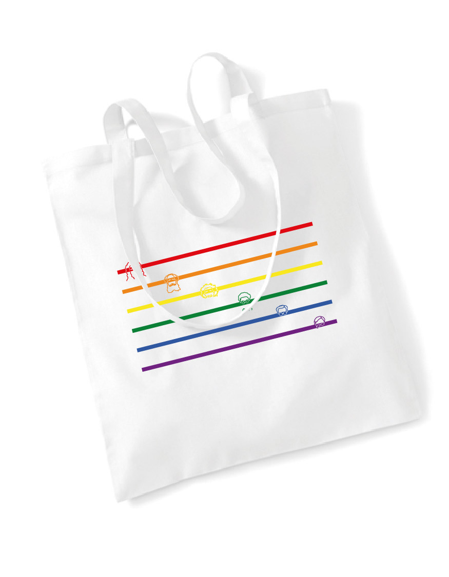 Tasche mit einer Variation der Regenbogenflagge als Motiv. Entlang der Streifen sind die Köpfe des Fachschaftslogos zu finden.