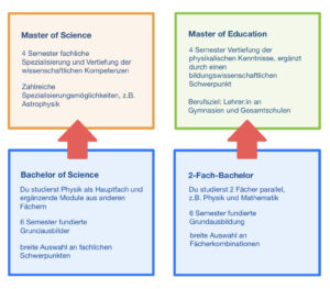 Hat man sich für das Physikstudium (und noch am besten in Bochum) entschieden, dann gilt es sich entweder für den Bachelor of Science oder den 2-Fach-Bachelor zu entscheiden, wobei auch ein nachträglicher Wechsel noch möglich ist. Darauf aufbauend gibt es dann die Masterstudiengänge, welche weitere Vertiefungsmöglichkeiten bieten.
